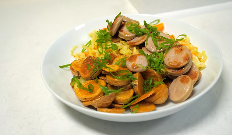 4. Plate the dish by adding some potatoes, cabbage and sausage.  Garnish with scallions.