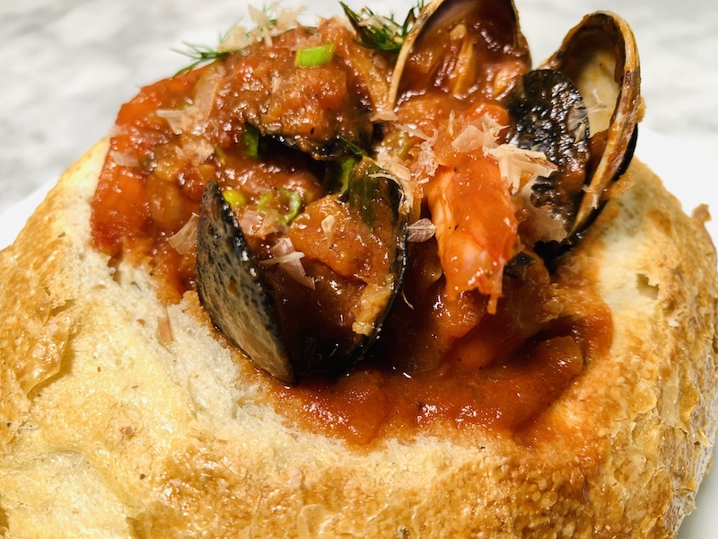 An Asian twist on a classic Cioppino, served in a sourdough bread bowl; a dish that’s truly San Francisco.