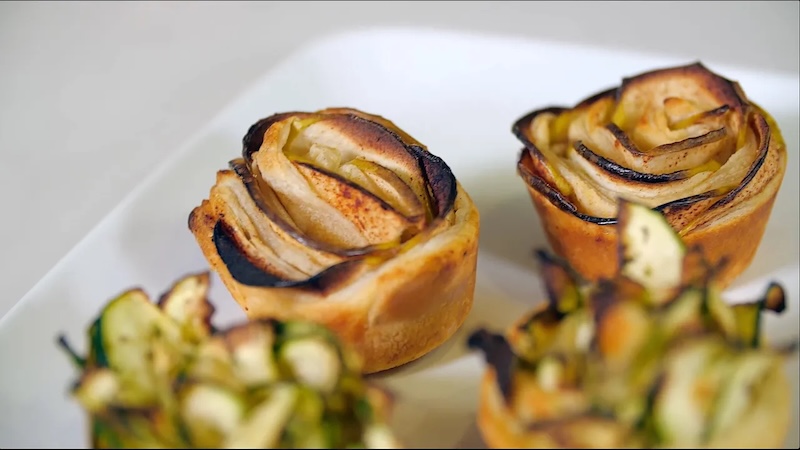 - Fold the puff pastry over the ingredients, making sure that part of the zucchini or apples is still visible.