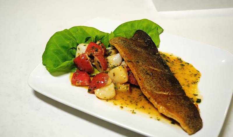 7. Plate by adding the sauce to the sides of the fish, not on the fish, to keep the skin crispy. Serve with potatoes and a few pieces of Bibb lettuce.