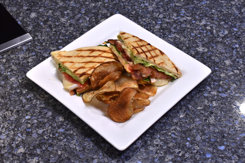 2. Assemble the Naan bread BLT by layering the lettuce, tomato, cheese, and bacon.