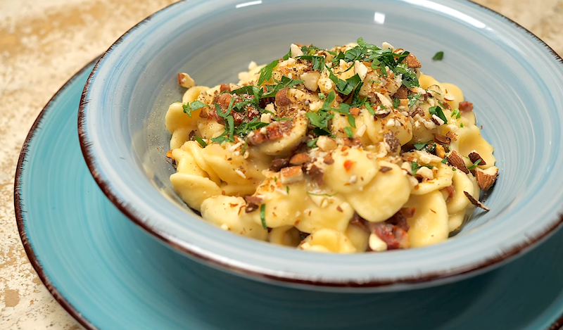 - Add a small amount of pasta water to the pan, according to your desired consistency.