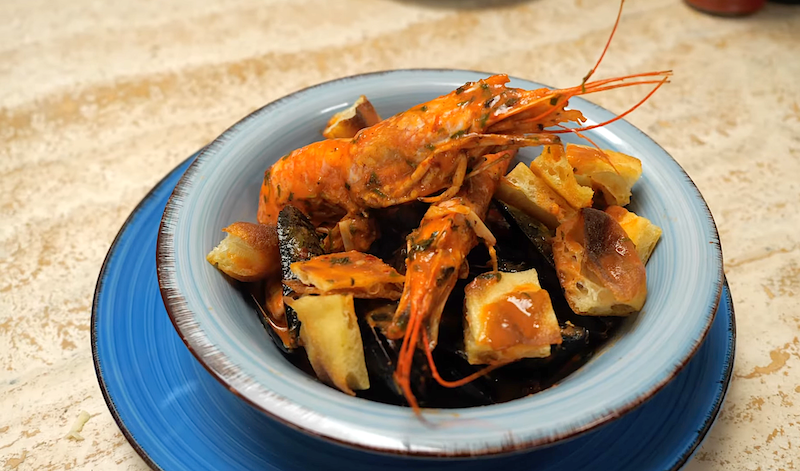 - In a bowl, add some of the toasted bread. Ladle some of the mussels and sauce. Place the shrimp on top and add more sauce and toasted bread.